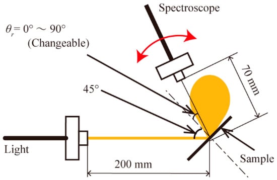 Measurement setup for the angular intensity distribution of the reflected light. The sample was fixed at 200 mm away from the tip of the optical fiber connected to the light source. The incident angle of light was fixed at 45°. The distance between the tip of the optical fiber connected to the spectroscope, and the sample was 70 mm. The core diameter of the fiber is 400 µm.