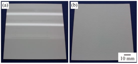 We measured the angular intensity distribution of the light that was reflected on the two sample surfaces with different visual textures. The measurement setup is shown in Figure 2. The distance between the tip of the optical fiber connected to the spectroscope and the sample was set to 70 mm, to measure the intensity of the mixture of specularly reflected light and scattered light. Measurements were taken every 5° while rotating the receiving angle θr (°) from 0° to 90°. Between the θr of 40° to 50°, measurements were taken every 1°. We used a 100 mm × 100 mm acrylic plate (Mitsubishi Rayon Co., Ltd., Tokyo, Japan), as shown in Figure 3a, and a sheet of white drawing paper (Sunflower M drawing paper, Muse), as shown in Figure 3b, which were a sample with a glossy surface and that with a matte surface, respectively.