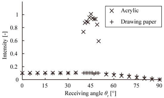 Figure 4 shows the resultant angular intensity distribution of the scattered light. For the acrylic plate, there was a peak at θr of 45°, and the distribution was almost constant at the other angles, which showed the effect of specular reflection. For the drawing paper, the distribution was almost constant at all angles, which showed the effect of scattering. Considering the distribution was almost constant between the θr range of 0° to 40°, for both sample surfaces, and a peak appears around 45° for only the surface showing specular reflection profile, we defined a scattering index S (−) that was the ratio of the scattering intensity r15 (−) at θr = 15° to the scattering intensity r45 (−) at θr = 45°. S can be written as follows: