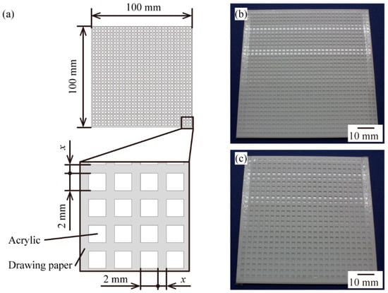 Samples for intermediate visual texture by spatial mixing: (a) schematic view of a sample. x (mm) denotes the length of the interval between the holes; (b) the sample of x = 1 mm (the proportion of acrylic plate α = 0.44); (c) the sample of x = 2 mm (α = 0.25).