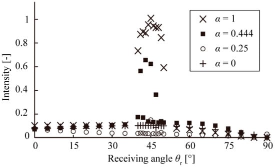 Angular intensity distributions of the reflected light from α = 1 (the acrylic plate), α = 0.44, α = 0.25, and α = 0 (the drawing paper).