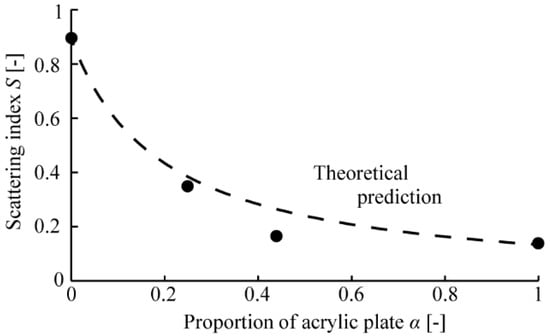 The broken line in Figure 7 is the theoretical prediction curve of Equation (4). Although the measured values from samples with α = 0.25 and 0.44 were slightly smaller than the theoretical values, the theoretical curve from Equation (4) fitted in measured values.