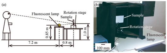 The sensory evaluation setup: (a) schematic view; (b) visual form. For the subject to be able to observe the evaluation sample at various illuminating angles, we placed the evaluation sample on top of a rotatory stage that made it possible to change the angle of the evaluation samples. The fluorescent lamp was placed 0.8 m away from the evaluation samples. The samples were evaluated in a dark room without any other light source.