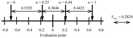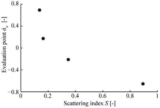 We calculated the evaluation point άα (-), as shown in Table 2. Figure 9 is a scale diagram, which plotted each άα of Table 2. We can judge there to be a significant difference when the distance between each άα is far greater than the yardstick (Y) (−) [23]. In this condition, Y0.01, denoting Y at a critical region of 0.01, was 0.282. The distance between each άα exceeded Y0.01, according to Figure 9, indicating that significant differences were visible with any surface sample. In other words, we confirmed that the spatial mixing of two different surface samples could present intermediate visual textures. When comparing the results of the optical evaluation with those of the sensory evaluation, we found that the sensitivity of the human eye to the surface of the object changes according to the scattering index of optical evaluation, as shown in Figure 10. These results indicated that visual texture through human sensation can be roughly quantified by scattering index obtained through optical measurements.