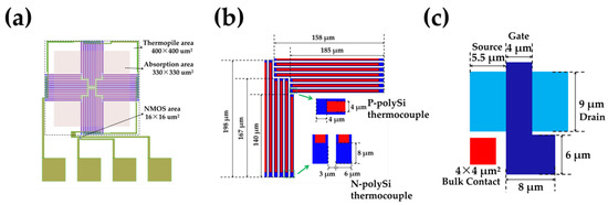 Figure 2 shows the schematics of the TISA pixel, the thermocouple, and the NMOS, respectively, that we designed. In the pixel, in order to maximize the number of thermocouples and place the hot junctions as close to the center of the absorption area as possible, the thermopile is designed with centrosymmetric structures and has an area of 400 μm × 400 μm and consists of 48 pairs of p+/n- poly-Si thermocouples with a 330 μm × 330 μm Si3N4 absorption layer. The NMOS has an area of 16 μm × 16 μm, whose effective gate width and effective gate length are, respectively, 4 μm and 9 μm.