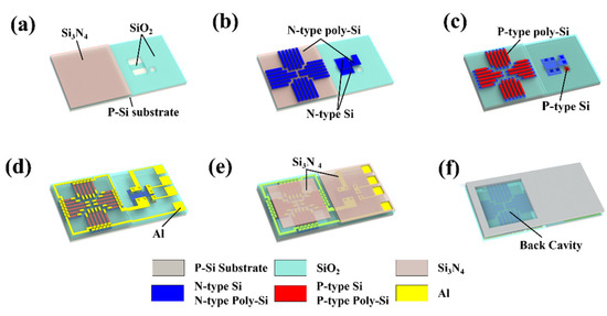 Monolithic integration of MEMS sensors and CMOS ICs can be categorized into three basic approaches: MEMS-first processing, MEMS-last processing, and interleaved MEMS and CMOS processing. In MEMS-first processing, all required processing steps for MEMS devices are achieved prior to CMOS processing. This method allows for very high-temperature processing of the MEMS materials, which is successfully applied in the high-volume fabrication of MEMS resonators and pressure sensors [16,17,18]. In contrast to the MEMS-first processing, in the MEMS-last processing, CMOS ICs are prepared before MEMS devices. MEMS-last processing makes it so that the CMOS design does not need to be modified and has greater design flexibility and shorter design cycles, for wide use in the commercial manufacture of displays, gyroscopes, accelerometers, and so on [19,20,21,22]. Interleaved MEMS and CMOS processing is achieved through a combination of MEMS processing steps performed before, after, or during CMOS fabrication. Interleaved MEMS and CMOS processing is suitable for MEMS devices by CMOS processes and offers the possibility of integrating high-performance MEMS devices together with CMOS ICs on the same substrate. This processing approach has been applied in various fields, ranging from pressure sensors and infrared sensors to neural probes [23,24,25]. Compared with the other two monolithic integration approaches, interleaved MEMS and CMOS processing can effectively reduce the number of masks to less than the sum of the numbers required for individual MEMS and CMOS ICs, respectively, and shorten the overall fabrication cycle.