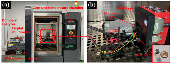 Subsequently, the devices were packaged in TO39 cans with 5.5–14 μm band-pass filters, and the cans were filled with nitrogen for reducing ambient noise, decreasing thermal conductance and enhancing light-wave transmittance. The test system for packaged devices is shown in Figure 4. A DC power analyzer (Keithley 6705C, Solon, OH, USA) provided two DC voltage sources. The current-–voltage (I-V), thermoelectric sensitivity and switching characteristics were measured using a semiconductor parameter analyzer (Keithley 4155B, Solon, OH, USA), a high-precision digital multimeter (Keithley DMM6500, Solon, OH, USA), and an IR blackbody (HGH, DCN1000H4LT, Igny, France). Meanwhile, in order to evaluate the performance of the TISA pixel integrated with the NMOS, we tested and compared it with a separate thermopile and a separate NMOS fabricated on the same wafer.