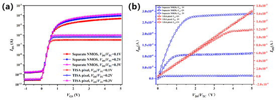 (a) ID-VDS/VTC and (b) ID-VGS characteristic curves of a TISA pixel and a separate NMOS.