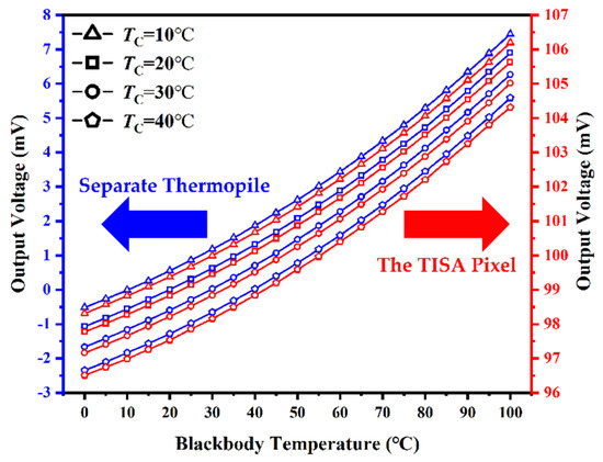 In order to evaluate the effect of ambient temperature on the devices’ performance, the sensitivity of the TISA pixel and a separate thermopile were measured with the system shown in Figure 4. In the test system, VGS and VTC were supplied at 5 V and 100 mV, respectively, to ensure that the NMOS in the TISA pixel operated in the triode region. Moreover, the constant temperature chamber (TC) was set to 10 °C, 20 °C, 30 °C and 40 °C and the blackbody provided a temperature range of from 0 °C to 100 °C. the output voltage–temperature of the blackbody curves of t TISA pixel and the separate thermopile with increasing temperature of the blackbody are shown in Figure 7. From the acquired data, it can be observed that the output voltages of the TISA pixel and the separate thermopile are relatively consistent. Additionally, with the decline of TC, the output voltage curves both move forward along the Y-axis. This is because the thermopile is a temperature-difference infrared detector. In the thermopile, the temperature of the cold junction is related to the ambient temperature, and the temperature of the hot junction is related to the target temperature. As ambient temperature drops, at the same temperature of the blackbody, the temperature difference between the cold junction and the hot junction increases, resulting in a larger output voltage of the thermopile and vice versa. Thus, due to the similar output voltage characteristics, subsequent readout circuits of the separate thermopile and the TISA pixel could both be calibrated by negative temperature coefficient (NTC) thermistor for ambient temperature compensation. Meanwhile, according to the obtained relationship between the output voltage and the blackbody temperature, the responsivity () of the TISA pixel can be calculated as 94.5 V/W and the noise equivalent temperature difference (NETD) can be calculated as 109 mK.