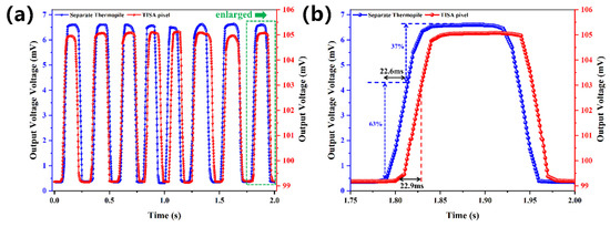 Figure 8a shows the response voltages of the TISA pixel and the separate thermopile under a blackbody radiation of 100 °C and a chopper frequency of 4 Hz in 2 s. When the TISA pixel was measured, 5 V and 100 mV voltages were applied at VGS and VTC, respectively, which ensured that the NMOS switch was at the status of ON. Figure 7b shows the one enlarged period of the response waveform in Figure 7a. Response times for the separate thermopile and the TISA pixel were 22.6 ms and 22.9 ms. The integrated NMOS switch does not extend the response time of the thermopile.