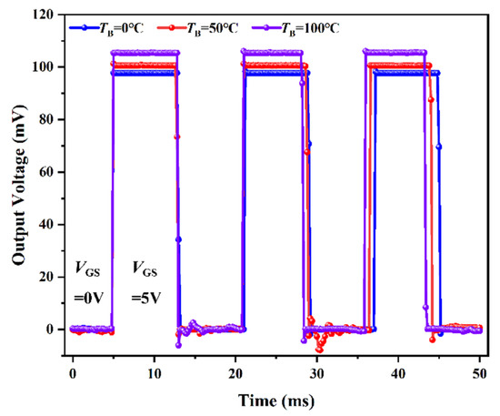 The readout of VOUT in the TISA pixel can be rapidly controlled by VGS at different temperatures of the blackbody, as shown in Figure 9. The measuring frequency of the multimeter was set at 5 kHz. It can be observed that some data cannot be collected on the rising or falling edge of VOUT jump. Therefore, it is assumed that the response time of the NMOS as a switch is less than 200 μs. Thus, in a TISA, the NMOS can be used as a switch to ensure that VOUT of each pixel is addressed in order, rapidly and effectively.