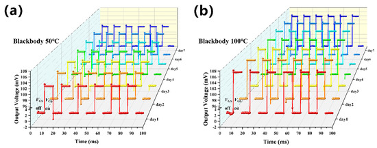 Figure 10 shows the stability test results of the TISA pixel. Over the course of one week, each day the sensor was measured at blackbody temperatures of 50 °C and 100 °C, respectively. The experimental results showed that the sensing and the switch performance of the TISA pixel remained consistent over time. Benefiting from the stability of the standard CMOS processes and the applied materials, the TISA pixel has good repeatability and reliability.
