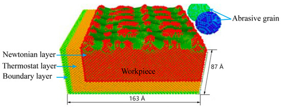 Constructing a molecular dynamics simulation model of abrasive microcutting was the first step in numerical simulation of molecular dynamics. In order to explore the influence of different angles on the microcutting process, boron nitride was selected as the abrasive grain, and single-crystal copper was used as the workpiece material to construct a simulation model of boron nitride particles grain microcutting of the single-crystal copper workpiece material. As shown in Figure 2, the simulation model of single-crystal copper was cut by two different angles of boron nitride particles grains. The model size was 144 Å × 163 Å × 87 Å, the abrasive radius was 15 Å, and the total atomic number in the model was 161058. Among them, the number of boron atoms was 1205 and the number of nitrogen atoms was 1220. The workpiece was divided into a fixed boundary layer, a constant temperature layer and a Newton layer, and periodic boundary conditions were adopted in the X direction of the workpiece to eliminate the boundary effect caused by the scale limitation of the simulation system. Before the simulation began, the simulation model was energy minimized to eliminate the unreasonable factors in the initial stage of modeling. The initial temperature of the analog system was set at 310 K. In order to balance the analog ensemble, the number of relaxation steps was set at 10,000 steps. The boron nitride particles grains were initially placed on the upper right side of the workpiece, the cutting speed of the abrasive grains was set to 80 m/s, the initial cutting depth was 15 Å, and the cutting angle was 5°, and the abrasive grains were cut in the -Y direction. The numerical simulation step of molecular dynamics was 100,000 steps, and the integration step size was Δt = 1 fs.