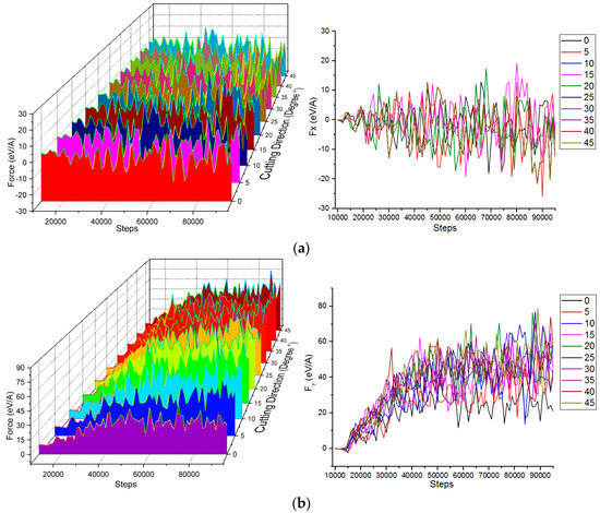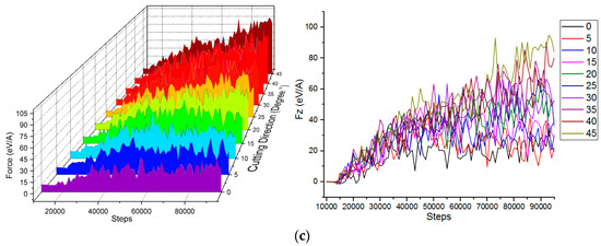 The direction of [00] the cutting force is shown in Figure 3a. Since the cutting direction was [0], the cutting force in the [00] direction was friction, so it goes back and forth and up and down around 0 eV/Å. As the cutting distance increased, the cutting force fluctuated reciprocally and showed an increasing trend. This phenomenon is closely related to the degree of deformation of the crystal lattice, lattice reconstruction, and the generation of an amorphous phase transition. The direction of [00] and [00] cutting force is shown in Figure 3b,c. The cutting force in the [00] and [00] directions was the shear force. As the number of simulation steps increased, the cutting distance gradually increased, and the cutting force in the direction of [00] and the direction of [00] fluctuated and gradually increased. After increasing to a certain value, it no longer increased, but was still in a wave state. In the initial stage of microcutting, atomic repulsive forces were generated between the abrasive particles and the workpiece atoms, which exhibited a small initial cutting force. To achieve the purpose of cutting, a larger cutting force was required to break the interaction between the workpiece atoms. After the abrasive particles were in contact with the workpiece, the cutting force required by the workpiece was gradually increased until the critical value of the bonding force between the atoms was exceeded. The lattice of the copper atoms was destroyed, and the chemically healthy fracture caused the copper atoms to move relative to each other. As the depth of cutting increased, the number of atomic interactions that need to be destroyed increased, and the cutting force tended to increase until the abrasive grains were completely cut into the workpiece, and the fluctuation state of the cutting force tended to be stable.