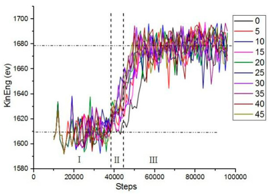 In order to study the influence of different cutting angles on the kinetic energy, the kinetic energy change in the simulation process was analyzed, and the work done by the abrasive particles to the workpiece in the microcutting process could be intuitively understood. Figure 4 shows the atomic kinetic energy curves at different cutting angles. The force between the workpiece atom and the abrasive particle was a long-range repulsive force during microcutting. As the distance between the abrasive particles and the workpiece atoms gradually decreased, the repulsion between the atoms gradually increased, and the copper atoms in the workpiece started to move to generate kinetic energy. When the number of simulation steps reached 38,000 steps, the kinetic energy of the atom fluctuated around 1609 ev. At this point the abrasive particles did not completely enter the workpiece. When the number of simulated steps reached 45,000 steps, the kinetic energy increased to 1678 ev. As the number of analog steps increased, the kinetic energy fluctuated around 1678 ev. When the abrasive particles were in contact with the surface of the workpiece, the atomic temperature of the contact zone increased, the lattice deformed, the coordinates changed, the displacement occurred, the thermal motion was enhanced, and kinetic energy was generated. As the abrasive particles began to enter the workpiece, the copper atoms in the workpiece began to move violently and the atomic kinetic energy increased. As the simulation progressed, the atomic strain energy of the workpiece entered a stable state, and the kinetic energy of the workpiece atom fluctuated up and down around a certain value, and the generation and transformation reached a dynamic equilibrium state. The cutting force drove the atomic temperature of the contact zone to increase, the thermal motion of the atom increased, and the kinetic energy also increased, resulting in a local increase in the kinetic energy of the copper atom.