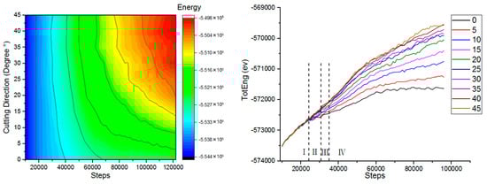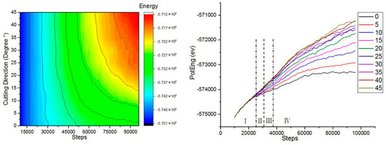 In order to study the effect of different cutting angles on total energy, the change of total energy in the simulation process was analyzed. Figure 6 shows the variation of the atomic total energy of the workpiece at different cutting angles. The total energy of the simulated system was the sum of atomic kinetic energy and atomic potential energy. The kinetic energy change of the workpiece atom was related to the thermal motion of the atom. The change of the cutting angle had little effect on the thermal motion of the atom, and the kinetic energy did not change with the change of the cutting angle. Therefore, the trend of total energy was similar to the trend of atomic potential energy. Unlike the change of kinetic energy, the change of potential energy and total energy was obviously related to the cutting angle. The cutting angle increased, the potential energy of the workpiece atom increased, and the total energy also increased.