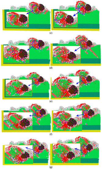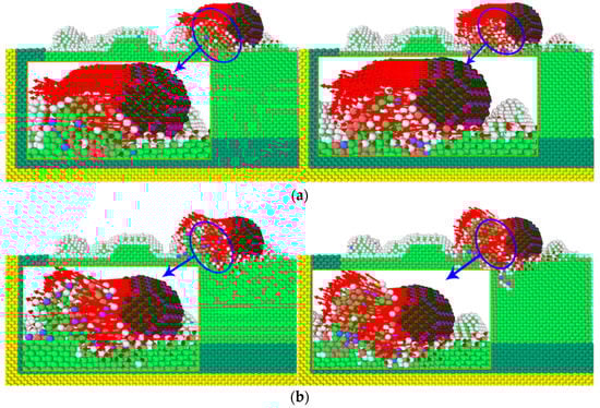 To inquire into the workpiece atomic displacement of abrasive cutting angle change, the influence of different cutting angles of the workpiece materials, grinding grain under function forms, the material removal process, the generation of chip and the change process, workpiece atoms according to atomic displacement coloring, the workpiece cutting area under different abrasive cutting angle profiled of atomic displacement, and local atomic displacement vector marking were analyzed, as shown in Figure 7.