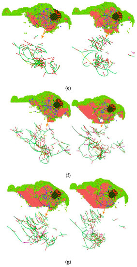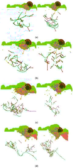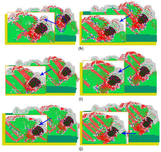 As shown in Figure 8, the simulation time was selected as 60 ps and 70 ps. According to the Ackland–Jones analysis method (Ackland–Jones analysis), atomic markers were labeled according to different arrangement structures of atoms to analyze the atomic displacement of the workpiece. Since the crystal lattice structure of single crystal copper was FCC, the atoms of FCC structure in the workpiece were removed to facilitate the analysis of lattice changes. In the figure, red, blue and light green represent HCP structure, BCC structure and amorphous structure, respectively. In the microcutting process, a large number of dislocation lines and lattice deformations occurred in the workpiece under the action of cutting forces, and more lattice transformed into HCP structures. The number of atoms of these structures increased with the increase of the cutting angle. During this phase transition process, the workpiece’s atomic strain kept increasing. When the atomic stress state exceeded the critical value of thermodynamic phase transition and was in a metastable state, the HCP phase began to form a nucleus and grew spontaneously, and the FCC lattice of copper became completely unstable, resulting in a sudden change in the mechanical quantity. With the progress of microcutting, due to the cutting and collision of grinding particles, the bonds between copper atoms broke, breaking the original lattice structure, and part of the copper atoms became disordered. At this time, this part of the atoms formed an amorphous structure. When the cutting angle increased from 0°to 45°, the cutting depth of the abrasive particles on the workpiece surface increased gradually, and the number of displaced atoms in the cutting area increased, and the original arrangement of more atoms changed, resulting in more lattice phase transitions. From the above analysis of energy, it can be seen that different cutting angles caused different changes in atomic energy, which indirectly affected the accumulation and release of strain energy in the material lattice, resulting in differences in the types and numbers of lattice phase transitions.
