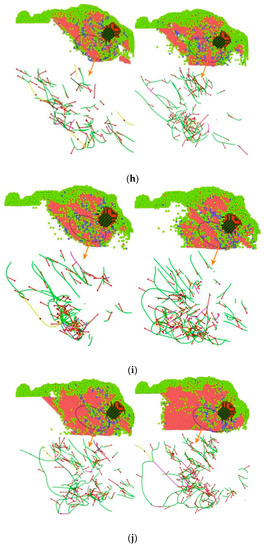 It can be seen from Figure 9 that as the number of simulation steps increased, the number of dislocations increased, the total length became larger, and the cutting angle was positively correlated with the length of the total dislocation line. As the cutting angle increased, the total length of the dislocation lines also increased significantly. When the cutting angle was 0° and 5°, the length of the dislocation line was the shortest, and the number of dislocations generated was small. Therefore, a smaller cutting angle was advantageous for reducing the defect structure inside the workpiece, thereby obtaining a better cutting effect.