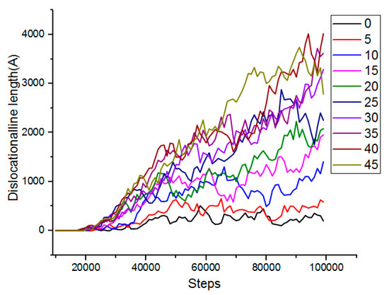 In order to more vividly describe the relationship between the cutting angle and the dislocation, the total length of the dislocation line generated during the cutting process of the boron nitride particles grains at different angles was analyzed, and the total length of the dislocation line generated during the microcutting process is shown in Figure 9.