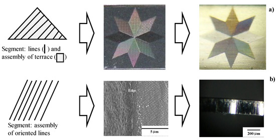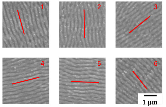 Nano-textures induced by LIPSS are controllable through optical path control. Figure 3 depicts how to control the orientation of nano-textures. The width of each LIPSS ripple is mainly determined by the pulse width. As discussed in [12,13], this orientation control of nano-textures reflects on the surface plasmonic diffraction.
