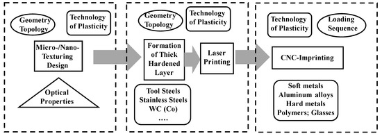 In the latter, a mother punch works as a tailored tool to transform a perfect shearing process design onto highly qualified product surfaces with use of the nano-texturing method, as shown in Figure 1b.