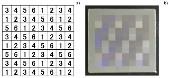 The six orientations above, in Figure 3, are varied and allotted into each square segmentation on the matrix with eight rows × eight columns, as shown in Figure 4a. Subsequently, the panel nano-textured by this matrix on the AISI316L plate has surface plasmonic colors, as shown in Figure 4b.