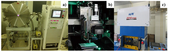 The insertion of a thick, hardened surface layer into the punch and die is necessary to make laser printing with a sufficient depth. The low-temperature plasma nitriding system (PN-03; YS-Electrical Industry, Co., Ltd.; Kohfu, Yamanashi, Japan) in Figure 5a was employed to form a nitrogen supersaturated surface layer without the precipitation of iron and chromium nitrides onto AISI316L and SKD11 punches, respectively. These punches and SKD11 die were plasma-nitrided at 673 K for 14.4 ks by 70 Pa. Other plasma processing parameters were optimized on the basis of the fundamental data analyzed by the plasma diagnosis [14].