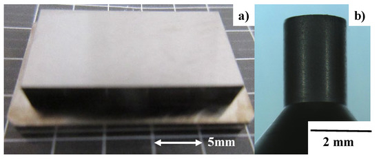 High-density RF (radio frequency)–DC (direct current) plasma nitriding was employed to harden and strengthen the AISI316L flat and SKD11 cylindrical punches. Two types of stamping punch were fabricated, as depicted in Figure 6. Both punches have a nitrided layer with a thickness of 50 μm and an average hardness of 1400 HV. Figure 7 depicts a cross-sectional SEM image and nitrogen mapping obtained using the cylindrical punch in Figure 6b.