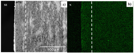 Detailed microstructure and nitrogen mapping of nitrided SKD11 punch. (a) SEM image of its cross-section, and (b) nitrogen mapping.