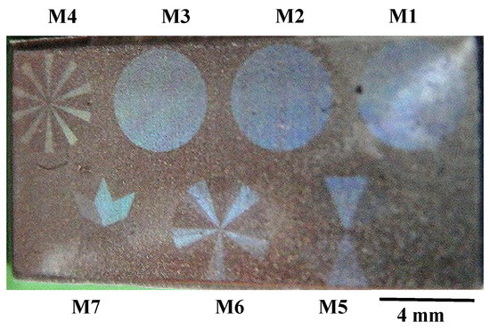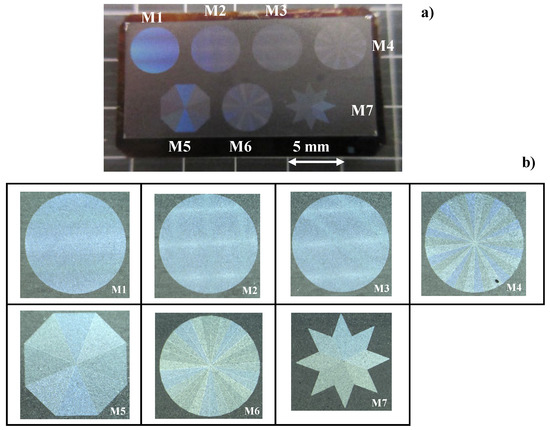 Figure 8a depicts the seven emblems, laser-printed onto the nitrided flat AISI316L punch. These emblems have color-grating by their micro-textures and surface plasmonic brilliance in dark blue by nano-textures. Each emblem in Figure 8b is cut into the nitrided flat punch with the size of 4 mm × 4 mm. The micro-/nano-texture formation in the emblem of M6 is explained in Figure 9.