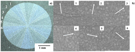 Micro-/nano-texturing in the femtosecond laser printing of M6 onto the nitrided flat punch. (a) Construction of M6 by micro-texturing in five repetitions of six segments, and (b) nano-texturing with controlled orientation in each segment from #1 to #6 in Figure 8a.