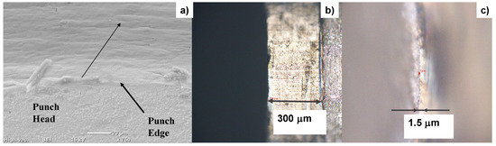 Both the head and the side surfaces of the plasma-nitrided cylindrical SKD11 punch with a diameter of 2 mm were trimmed by the femtosecond laser processing to sharpen their edges and to reduce the surface roughness. Figure 10a depicts the trimmed top and side surfaces of the nitrided punch across its edge. This punch side surface was laser-trimmed down to a depth of 6 μm along a length of 300 μm, as depicted in Figure 10b. Nano-textured grooves were expected to superpose onto the trimmed surface simultaneously with the femtosecond laser trimming process. Owing to the two-step laser trimming on the punch head and side surfaces, the punch edge was sharpened, as shown in Figure 10c. The original dull edge width of around 10 μm was sharpened down to 1.5 μm by this trimming.