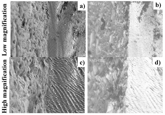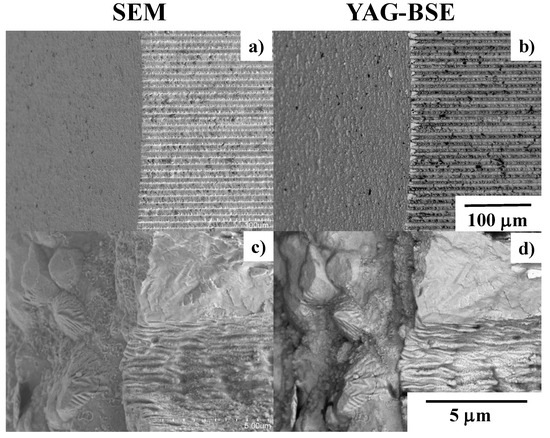 SEM and YAG-BSE images on the top and side surfaces of laser-trimmed SKD11 punch across its edge (a,b) in low magnification, and (c,d) in high magnification.