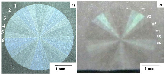 We will now describe the CNC-imprinting behavior of each emblem on the laser-printed die onto the aluminum plate. An M6 emblem was also employed for this comparison. As shown in Figure 13, the original M6 emblem was imprinted onto the aluminum plate in the mirror-image inversion. That is, as shown in Figure 13a, six segments from 1 to 6 in anti-clockwise order in M6 were imprinted to six segments from #1 to #6 in clockwise order in the replica of M6, as shown in Figure 13b. This proves that the original micro-textures on the laser-printed die were accurately coined onto the aluminum plate.