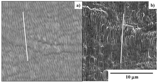 An SEM analysis with high magnification was performed to describe the nano-texture imprinting onto the aluminium plate together with the transcription of the micro-texture M6 in Figure 9. Figure 14 compares the SEM images between the original nano-texture in segment #1 in the M6 emblem in Figure 9 and the nano-textures coined onto the aluminum plate surface. Each nano-texture in Figure 14b is aligned in the uniaxial directions with the same ripple width and depth as the laser-printed nano-textures, shown in Figure 14a. The orientations of the nano-textures in Figure 14a,b were in mirror-image inversion; for example, −30° in the original nano-textures in Figure 14a, corresponds to +30° in the coined nano-textures in Figure 14b. This comparison of the nano-textures reveals that the tailored micro-textures in Figure 8 and Figure 9 and nano-textures in Figure 14a were concurrently imprinted accurately onto the work material surface.