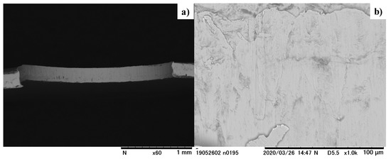 The laser-trimmed SKD11 punch was fixed into the upper die set for piercing the electrical steel sheet with a thickness of 0.15 mm. The core die was also cemented to the lower die set. The CNC stamping system was also utilized for the fine piercing experiment. Figure 15 depicts the electrical steel sheet perforated by this piercing. As shown in Figure 15a, no fractured areas were seen on the pierced hole surface. After the SEM analysis of this pierced hold surface, the whole surface was fully burnished, as shown in Figure 15b.