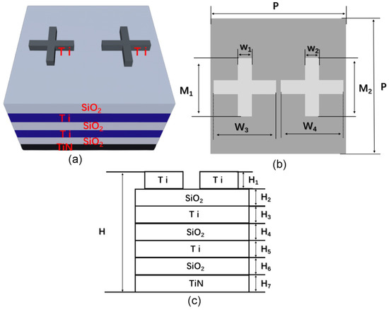 The absorber structure proposed in this paper is shown in Figure 1. As shown in Figure 1a, a cross-shaped nanopillar array was set on the top of the multilayer structure, of which the material was titanium. Two types of cross-shaped nanopillars with different widths were designed in one period (see Figure 1a). However, the two kinds of cross-shaped nanopillars have the same height, length, and arm width. To depict and discuss our results clearly, we defined the period of the array as P. The length, arm width, and height of the two kinds of cross-shaped nanopillars were defined as M, W, and H1, respectively. The widths of the two crosses were defined as W3, and W4, respectively. The bottom multilayer was formed by stacking Ti and SiO2 layer alternately. A thick titanium nitride substrate was used in the designed structure to ensure the complete absorption of light. All the specific parameters of the structure proposed in this paper are listed in Table 1.