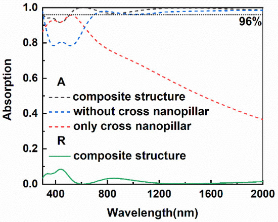 Figure 3 shows reflectance and absorptance curves of different absorbers, including composite structure, a multilayer structure without top nanopillars, and a pure nanopillar array. It can be seen from the figure that the absorptance of the absorber without a cross-shaped structure presents an obvious reduction, in comparison with that of the absorber with a composite structure, in the range from 300 nm to 800 nm. Absorption of the absorber without the cross-shaped structure is also weakened in the range of 1000–1500 nm. Though the absorber without a top cross-shaped structure shows a high average absorptance, introducing a cross-shaped structure on top of the multilayer structure certainly helps the bottom multilayer to improve the total absorption. Then, the overall absorption increases from 0.88 to 0.96. It is apparent in Figure 2 that the pure cross-shaped nanopillar array shows a strong absorption right in the range from 300 nm to 600 nm, which is right complementary to that of the bottom multilayer. As a result of those complement absorptive characteristics, the absorption of composite structures displays a near-perfect absorption effect in broadband. The absorptance in the full wavelength range exceeds 0.92 and even exceeds 0.96 from 500 nm to 2000 nm. It also can be seen from the figure that there are two valleys in the absorptance curve at 455 nm and 868 nm, corresponding to the absorptance of 0.92 and 0.97, respectively. The maximum absorption is close to 1.0 at 620 nm. The results show that the structure can achieve a near-perfect absorption effect in broadband. Since there is no light passing through the absorber with the composite structure, only absorption and reflection occur as the light incident on the absorber. The near-perfect absorption also means there is almost no reflection in the absorber (See Figure 2). To further illustrate the reason for obtaining high absorption in the broadband based on the composite structure, we compared electric field distribution at different cross-sections of the composite structure, as shown in Figure 4.