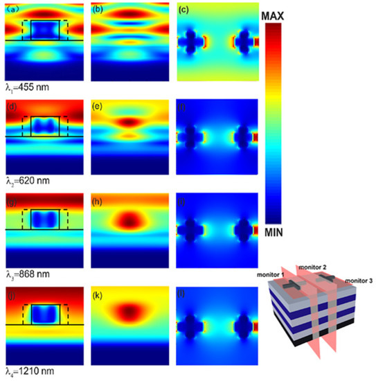 To study the physical mechanism of the enhancement in light absorption by introducing the cross structure, we simulated the distribution of electric fields at the spectral valleys and peaks. The calculated electric field distribution in different cross-sections was obtained by three different field monitors, which is shown in the right-down corner of Figure 4. Figure 4a,d,g,j depict the electric field distributions in the cross-section of the cross, which are obtained from monitor 1. Figure 4b,e,h,k shows the electric field distributions in a perpendicular plane between two crosses, which are obtained from monitor 2. Figure 4c,f,i,l present the electric field distributions in the cross-section of the cross-shaped structure, which are obtained from monitor 3. From Figure 4a–c, it can be seen that the electric field around the top cross-shaped structure shows a high intensity at 455 nm. However, the electric field in the cross structures’ gap, i.e., the electric field recorded by monitor 2, is weakened due to a weak plasma resonance. The weak plasma resonance can’t sustain a strong absorption, leading to energy leakage. Figure 4d–f show the electric field distribution at 620 nm, where the strongest absorption occurs. It can be seen from the graph that strong electric fields exist not only around the cross structure but also in the gap between the two cross structures. The distribution of the electric field indicates that there is a strong plasma resonance coupling at this wavelength. The strong coupling leads to strong energy absorption. Lastly, the absorptance at this wavelength is improved. Figure 4g–i shows an electric field distribution at the wavelength of 868 nm. It can be seen from these figures that the electric field distribution is still around the cross structure, but the electric field in the middle gap is weakening. However, it is still higher than the intensity of the electric field at the wavelength of 455 nm. As a result, the absorption of the device at this wavelength still maintains high efficiency. Figure 4j–l are the electric field distributions at a wavelength of 1210 nm. It is evident that the electric field is mainly distributed at the four ends and at the top of the cross structure. In addition, there is a certain electric field distribution at the cross structure and the underlying intersection. Accordingly, the plasma effect is enhanced. Then, strong light absorption occurs. According to the evolution of electric fields at various wavelengths and positions, it is found that the electric field is mainly limited around the cross structure. The results also reveal that the plasma resonance strongly affects absorption enhancement in the composite structure.