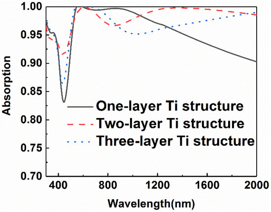 To further illustrate the relationship between light absorption and the parameters of each part in the structure, we investigated the evolution of absorption as the parameters of the structure change. Firstly, the change of absorption of the absorber is investigated as the number of titanium layers changes. Figure 5 shows the absorptive curves of the absorbers with different numbers of layers in the bottom multilayer, as the thickness of each titanium layer is fixed at 8 nm. The results manifest that there is no need to realize a high absorption by continuously increasing the number of titanium layers. The best scheme is two layers of titanium for this structure. As the number of titanium layers exceeds two, the overall light absorption efficiency begins to degrade. When the number of titanium layers increases to two, the minimum absorptance of the device also increases from 0.80 to 0.92. However, if we increase the number of titanium layers in the absorber further, it is found that the absorptance tends to decline. The results reveal that, when the underlying structure is coupled with the cross structure, it is unnecessary to improve the overall absorption by increasing the number of titanium layers. Therefore, the absorption reaches the strongest because of the strong plasma resonant coupling when the number of metal layers is two.