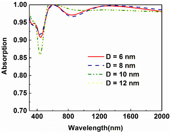 Since the number of bottom titanium layers is determined, the influence of the metal thickness on the absorption is studied further. Figure 6 shows the absorptive curves of absorbers with various thicknesses of titanium. It can be seen from the diagram that the overall absorptance increases at the beginning. As the thickness of the titanium layer increases, the absorptance in the short-wavelength range tends to decline. As shown in Figure 6, there is a notable decrease in absorption in the range from 400 nm to 500 nm as the thickness of the Ti layer increases to 10 nm. The trend is similar to that of the change as the number of Ti layers changes. Therefore, for the metal layer, we choose a thickness of 8 nm as the thickness of this structure.