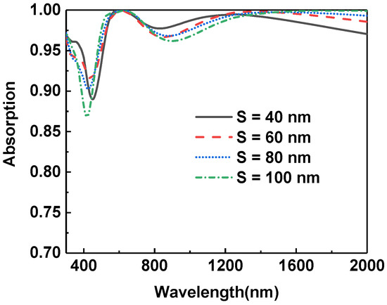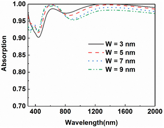 Since this absorber is composed of a nano-cross array and a multilayer plane structure, the effect of the top nano-cross array was also investigated. The change of absorptance curves is shown in Figure 8 as the arm width of the two types of the nano-cross in one period are changed to 3 nm, 5 nm, 7 nm, and 9 nm. It can be seen from the figure that as the width of the cross structure increases from 3 nm to 9 nm, the absorptance in the range from 400 nm to 700 nm ascends while it declines in the longer wavelength range.