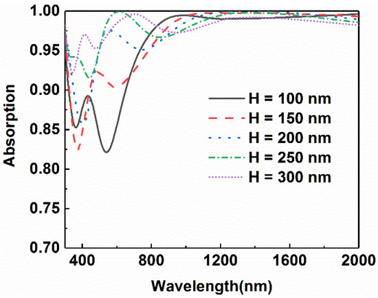 Figure 9 shows the absorptance curves of the designed absorber as the height of nano-cross changes to 100 nm, 150 nm, 200 nm, 250 nm, 300 nm, respectively. It can be seen from the diagram that the overall absorption efficiency presents a notable increasing trend in the range from 500 nm to 900 nm, though there is a slight decline in the range from 900 nm to 1200 nm. As the height is 250 nm, the average absorption efficiency can reach 0.96. The absorption efficiency even reached 0.97 when the height is as high as 300 nm. It is very clear that the increment of height results in an improvement in the absorption efficiency. The increase in absorption in the short-wavelength range is attributed to the enhancement of the surface plasma effect, while the dominant coupling in the long-wavelength range is the coupling in the bottom multilayer. Finally, it is more suitable for practical application when the height is 250 nm in consideration of other factors, such as processing complexity and manufacturing costs.