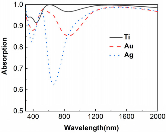 In order to manifest the advantages of using titanium, the total absorption of the composite absorber as the metallic material changes is plotted in Figure 10. It is clear that the worst absorption occurs as the metallic material is changed to Au and Ag, though the two materials possess a strong plasmon effect. In the wavelength range from 500 nm to 2000 nm, there is an entire reduction in absorption as the metallic material changes. The reason for such a reduction of absorption lies in the weaker extinction coefficients of the noble metals and the mismatch of the refractive index. It should be noted that there are two dramatic dips both in the absorptance curves of Au and Ag. This means strong reflections occur at these wavelengths, which are typically derived from the mismatch of the refractive index.