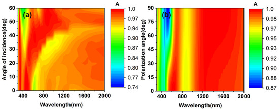 Another concerning characteristic of solar absorbers for practical application is the response of the absorber to the polarization and the incident angle. Figure 11 presents the evolution of absorptance as the polarization angle and the angle of incidence change. When the angle of incidence increases from 0° to 60°, there are almost no changes in the absorptance, except in the short-wavelength range. As the polarization angle changes from 0° to 60°, the overall absorber can maintain a good absorption efficiency in the full range of 300~2000 nm. The results show that the structure of the cross and the underlying plane coupling can have a better absorptance on the broader range and present an angle-insensitivity and polarization-irrelevant.