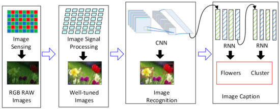 Modern vision tasks consist of the ISP algorithms and DNNs. In the application areas, such as industrial automation, security monitoring, and autonomous navigation, CNNs are the most commonly-used tools in vision tasks [18,19,20,22,30]. They are used directly for image recognition or as the backbone of objection detection networks. On the other hand, hybrid DNNs are also applied for some fields within the CNN-RNN framework [31,32]. Generally, ISP and CNN tasks are required for all vision tasks, and the RNNs are also used in some cases. To achieve high power efficiency and high processing speed, the VPU should exploit the sharing scheme of the hardware resources for both the ISP algorithms and the DNNs. Moreover, the VPU should be able to execute the CNNs alone, and the hardware resources for the RNNs should be multiplexed by the CNNs.