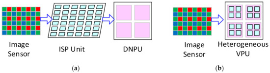 Figure 2. The vision systems: (a) The current vision systems with the ISP unit and the DNPUs; (b) The vision systems with the proposed heterogeneous VPU connected with the image sensor directly.
