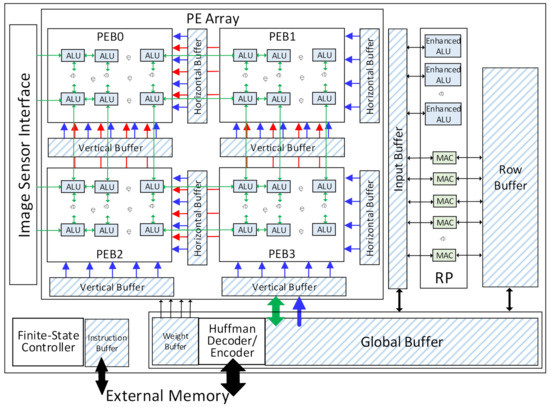 As shown in Figure 3, the VPU consists of a 2-D PE array, a row processor (RP), a global buffer, and several specific-application buffers. The 2-D PE array comprises four PE blocks (PEBs) and one ALU array. Each PEB has a vertical buffer and a horizontal buffer to provide the input data during the CNN tasks, while the weights are accessed from the weight buffer. The ALUs are embedded in the PEBs by connecting each ALU with two Pes, as shown in Figure 4. The ALUs can process the data from the Pes. The leftmost column of ALUs can also get the RGB-RAW image data from the image sensor interface directly and perform the ISP algorithms as required. The row processor is composed of a 1-D MACs array and several enhanced ALUs. It has a row buffer and a sharing buffer. The global buffer is the main on-chip memory. It stores the prefetched input data from the external memory and the intermediate data from the PE array and the row processor. The data exchange between the VPU and the external memory is accomplished through the Huffman encoder/decoder module. All the intermediate data and the weights data for the DNNs are compressed with the two-symbol Huffman coding before being stored into or loaded from the external memory. A finite-state controller (FSC) decodes the instructions and generates the control signals for each module in the VPU.