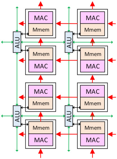 Each column of the image pixels from the sensors will be acquired by the leftmost column of the ALU array and then transmitted to the right ALUs column by column. After a pixel reaches the predefined ALU, it will be stored in the Mmems of the Pes connected with the ALU. The image pixels will be evenly distributed to the ALUs, and each ALU can store a tile of pixels in the Mmems. It should be noted that the size of the tiles is flexible, as illustrated in [1,33]. It is not necessary to store the whole image in the Mmems. The image can be divided into several patches. The ALU array can store one patch at one time and execute the ISP algorithms on the stored pixels. Other patches will be cached in the global buffer or even the external memory. This enables the sharing of the Mmems for the ISP tasks and the convolutional layers since the convolutional layers have the priority to use the Mmems.
